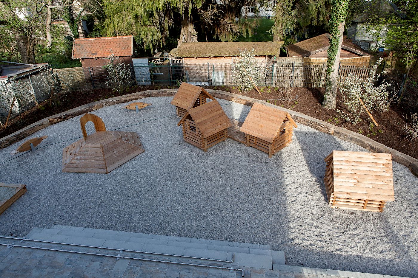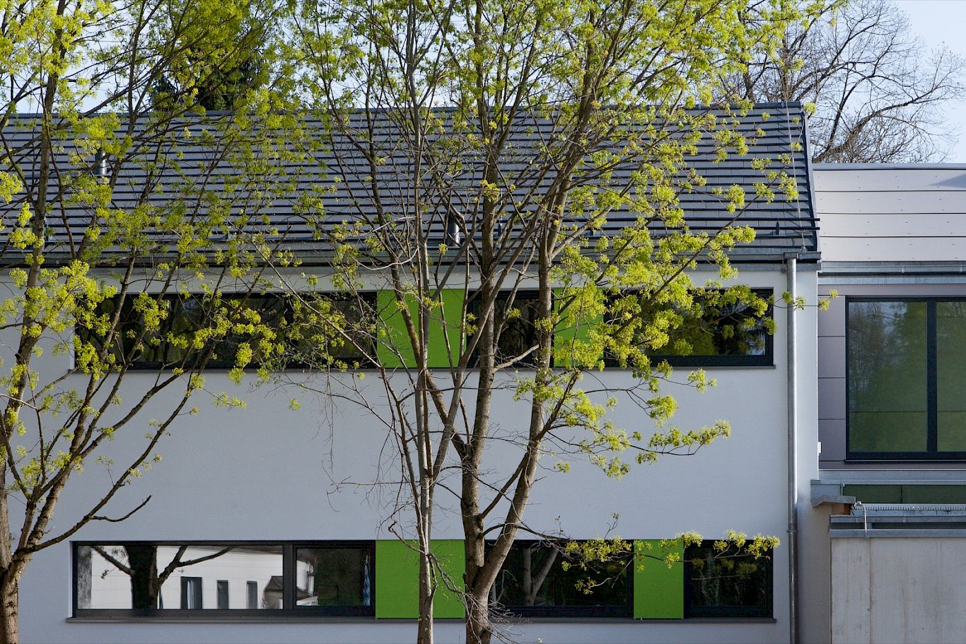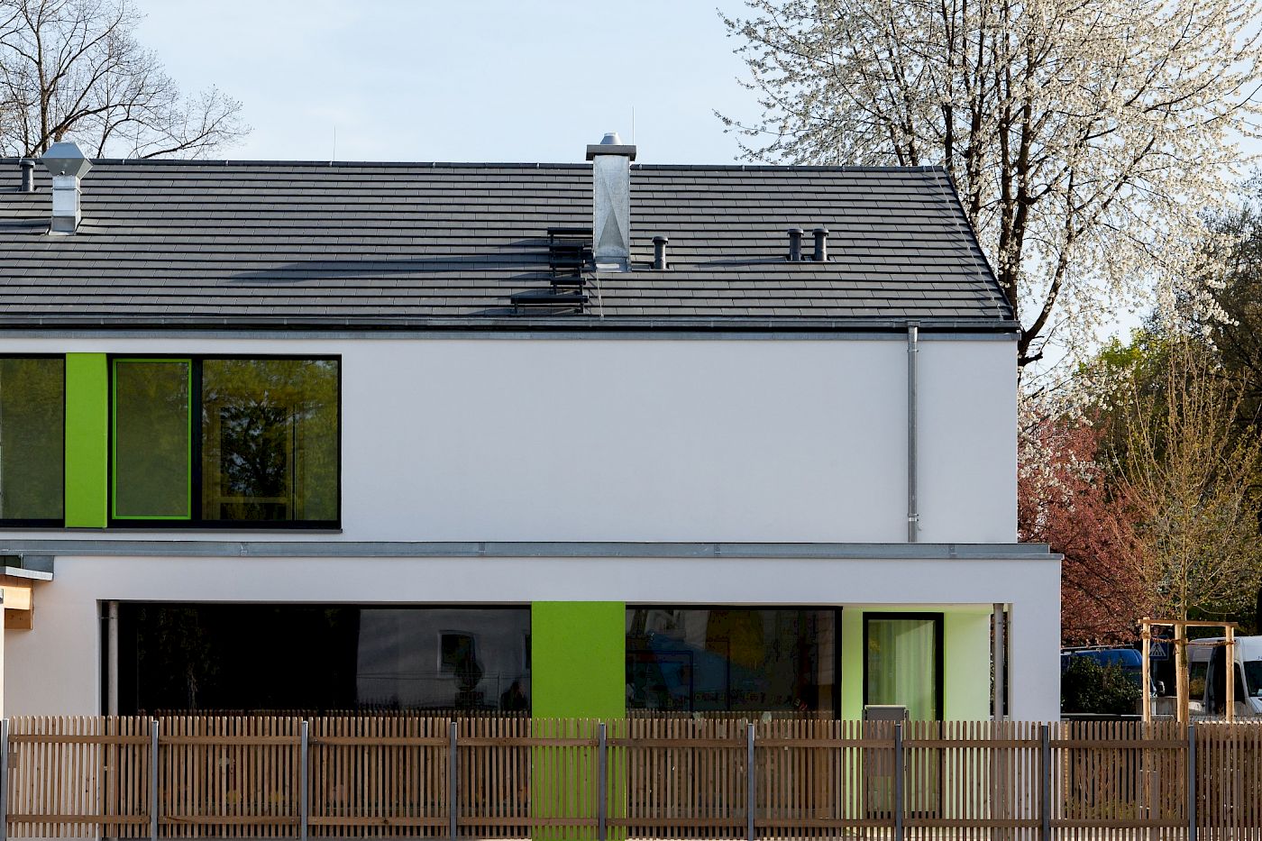 Inmitten eines Wohngebiets sollte eine inklusive Kinderkrippe für Kinder mit und ohne Behinderung gebaut werden, die sich in Volumen und Form an die umgebende Bebauung anlehnt und einfügt. Aufgrund des für diese Nutzung schmalen, aber langen Grundstücks wurde ein längs gestreckter, zweigeschossiger Baukörper entwickelt, der in jedem Geschoss zwei Kinderkrippen-Gruppen beinhaltet. Im Obergeschoss wurde ein großzügiger Mehrzweckraum eingeplant. Die Versorgungsküche und der Waschbereich wurden in das Untergeschoss verlegt. Der Zugang zur Kinderkrippe kann vom Vorplatz aus direkt über die Haupteingangstür oder aber auch über einen bereits zum Innenbereich gehörenden Kinderwagen-Raum erfolgen, der direkt in die Eingangshalle mündet und somit auch als Schmutzbremse dient. Im rückwärtigen Grundstücksteil wurde Platz für einen großzügigen Spielbereich geschaffen. Die gesamte Anlage mit Gebäude und Außenanlagen ist barrierefrei nach DIN 18040 T2 geplant und ausgeführt.